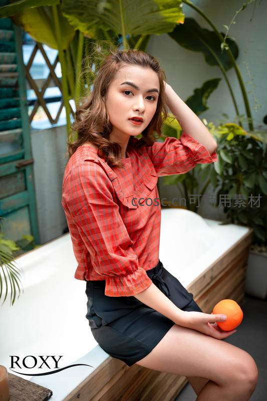 穿着红色格纹衬衫和黑色短裤的女子坐在庭院白色长凳上,手托橙子,姿态自然,身后绿植环绕,整体风格清新时尚,充满生活气息。