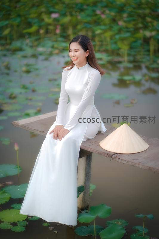 女子身着纯白长裙,倚靠在荷塘木台,面带微笑望向远方,身旁放置传统斗笠,背景满池碧叶粉荷,营造出诗意悠然的田园画卷。