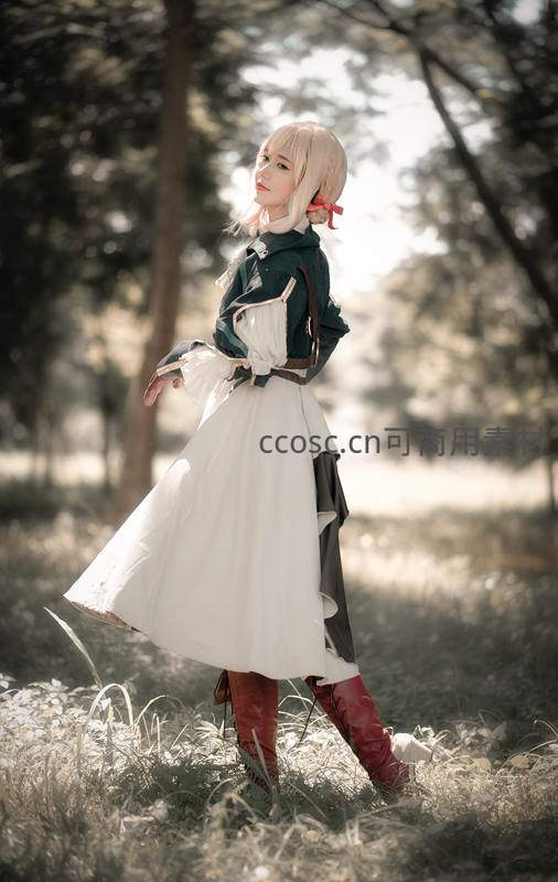 金发少女身着精致角色扮演服饰,在阳光斑驳的树林中回眸凝望,白色长裙随风轻扬,红靴点缀其间,充满童话般的梦幻与艺术感。