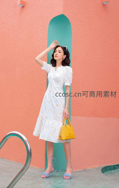 一位女士身穿白色碎花连衣裙,手提亮黄色小包,脚踩蓝色绑带凉鞋,站在青绿色拱门下,一手遮阳,姿态俏皮可爱。