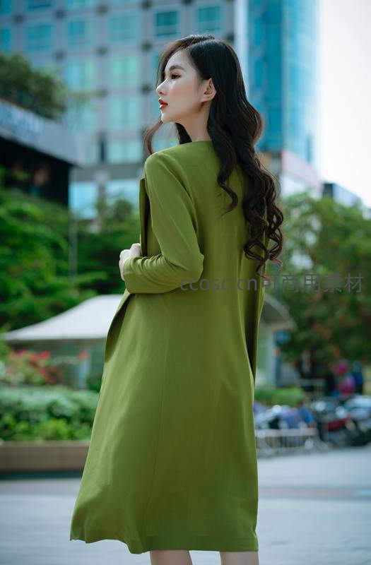 一位身着简约绿色长裙的女性侧身站立于城市街头,身后是现代化高楼与绿植,柔和光线勾勒出她柔美轮廓与宁静气质。
