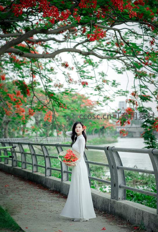白衣女子桥畔赏凤凰花