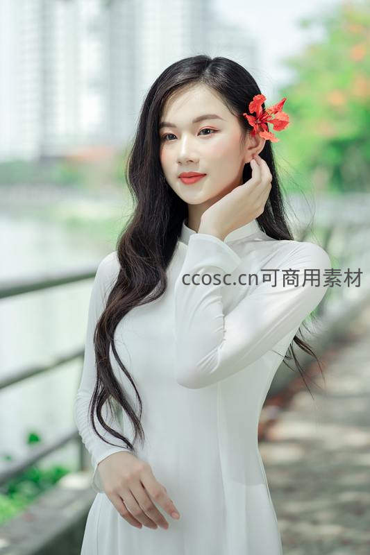 女子身穿白色长裙,耳畔别着一朵红花,轻抚脸颊,眼神温柔,背景虚化的城市建筑衬托出她的清新脱俗与自然之美。