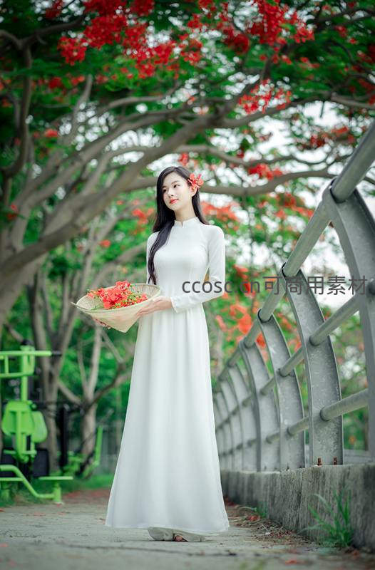 在繁茂的凤凰花树下,一位白衣女子静静站立,双手捧着装满红花的竹篮,身后是金属栏杆与绿意盎然的公园,画面诗意盎然。