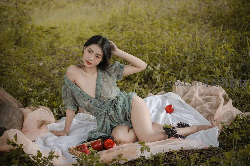 女子身着碎花裙,慵懒地倚靠在草地上的白布上,身旁摆放着新鲜葡萄与红椒的果篮,阳光透过树叶洒落,营造出田园野趣氛围。