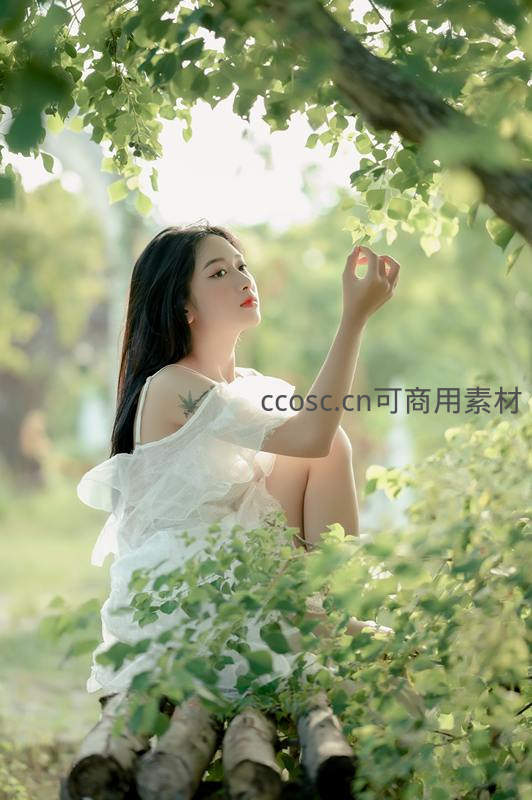 女子身着飘逸白衣,坐在林间木桩上,仰头轻触树叶,阳光透过枝叶洒落,营造出清新、宁静、贴近自然的美好意境。
