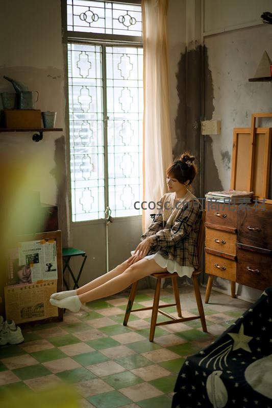 阳光透过雕花玻璃窗洒入房间,女子静坐于木椅之上,绿白方格地砖与老旧家具营造出浓厚的怀旧氛围。