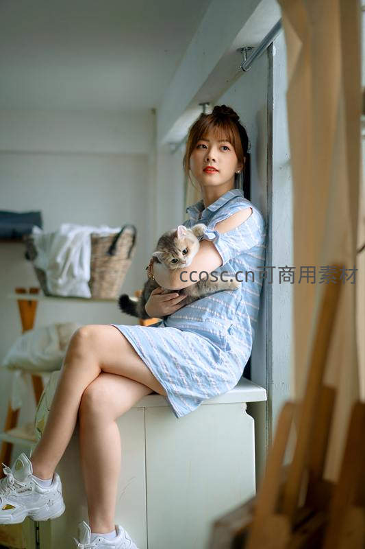 女孩穿着条纹连衣裙,坐在柜子上轻抱一只英短猫,眼神温柔,背景是充满生活气息的居家环境。