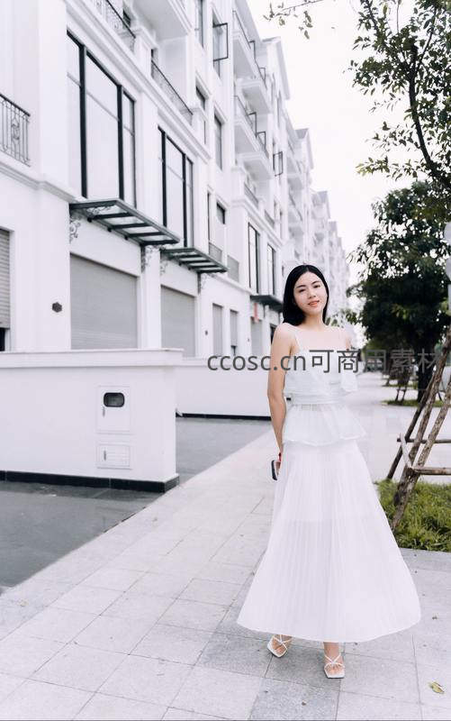 一位身着纯白吊带长裙的年轻女子,在整洁的现代住宅区街道上缓步前行,背景是简约的白色建筑与绿树,氛围宁静而美好。