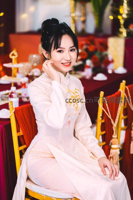 一位穿着淡雅刺绣旗袍的女子在布置精美的宴会厅中优雅落座,面带微笑,背景红金配色营造出喜庆而高贵的节日氛围。