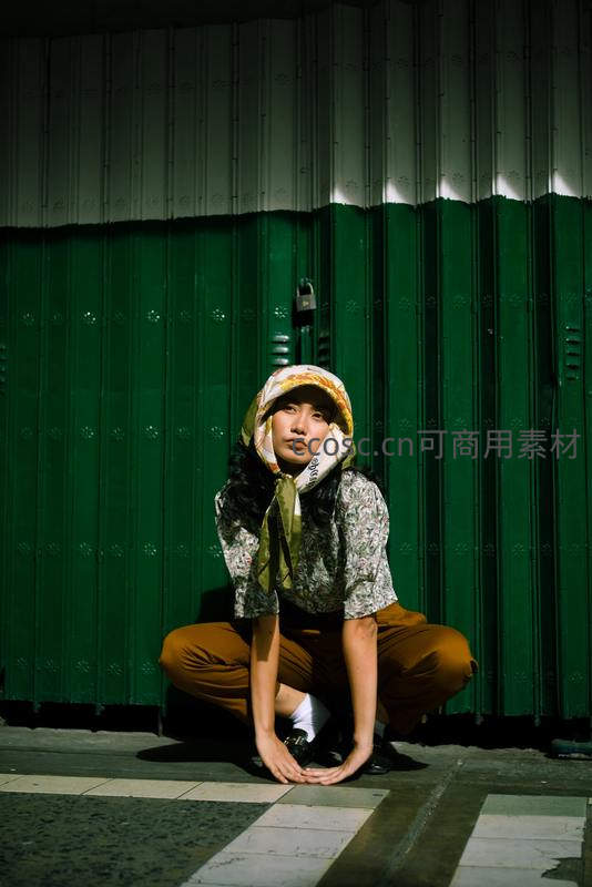 少女蹲在深绿色卷帘门前,头戴印花头巾,眼神直视镜头,光影对比强烈,展现出独特的街头个性与复古文艺气息。
