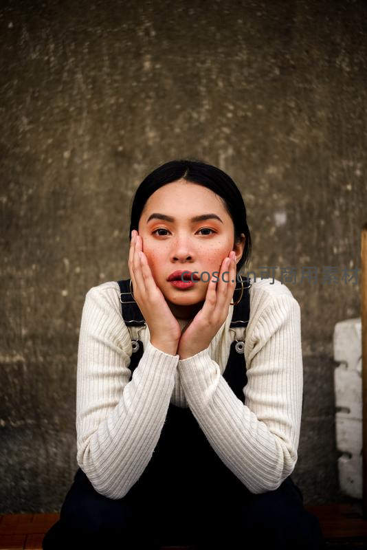 素颜少女托腮凝视,质朴背景衬托纯真表情