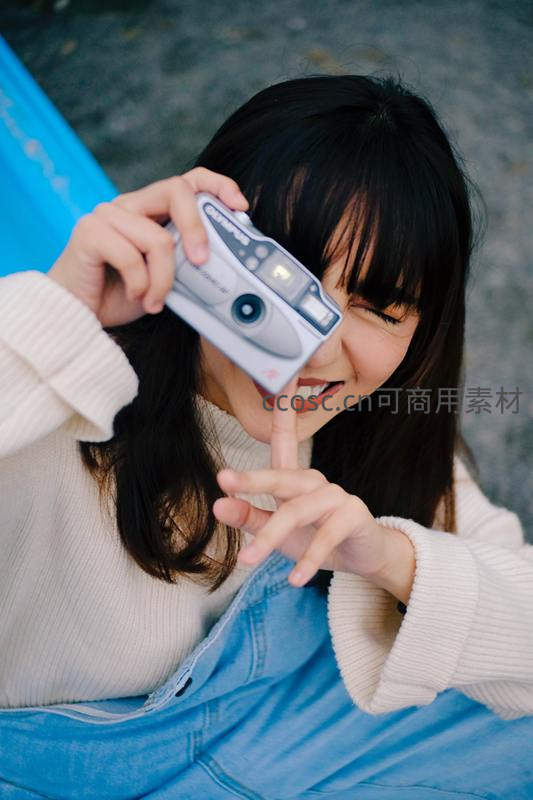黑发少女穿着白色毛衣和蓝色背带裤,手持一台银色胶片相机对着镜头调皮眨眼,笑容灿烂,背景模糊中可见蓝色帐篷一角,洋溢着轻松愉快的青春气息。