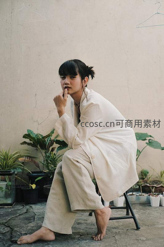 一位女子身着宽松白色套装,赤脚坐在庭院的小凳上,手指轻触唇边陷入沉思,周围绿植环绕,营造出宁静、舒适的生活意境。