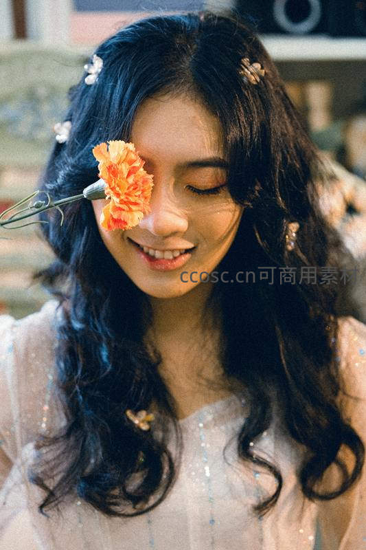 黑发少女面带微笑,将一朵橙色康乃馨轻放在眼前,发间点缀着小巧花饰,整体氛围温柔而浪漫,充满春日气息。
