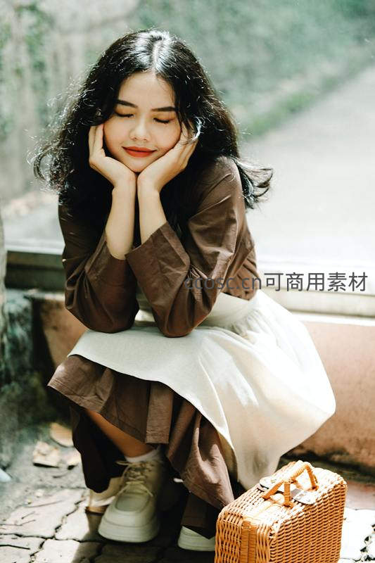 女子坐在石阶上,双手托腮微笑,身旁放着小巧藤编包,身穿棕白搭配服饰,阳光洒落,营造出悠闲惬意的午后氛围,充满生活情调。