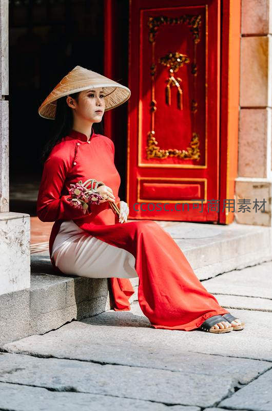 一位身着红白相间奥黛的女子坐在古朴石阶上,背后是厚重的朱漆大门,她手捧莲花,头戴斗笠,神情安然,营造出一幅充满东方禅意与生活诗意的画面。