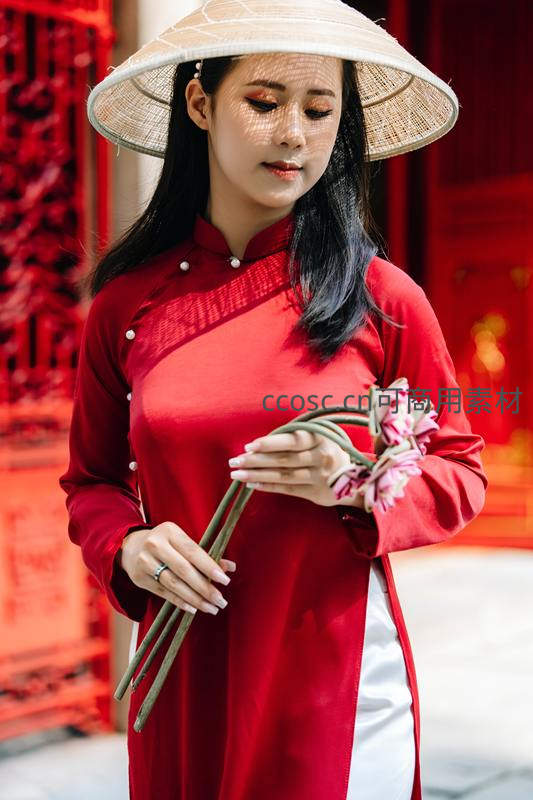 一位身着红色传统服饰的女子,头戴竹编斗笠,手持粉色莲花,背景为红色雕花建筑,展现宁静优雅的东方古典美。