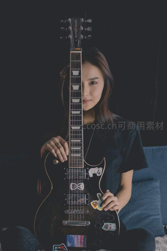 一位年轻女孩怀抱一把贴满个性贴纸的黑色电吉他,眼神专注而富有表现力,展现出青春与音乐的完美融合。