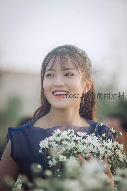 少女怀抱一束洁白雏菊,仰头绽放灿烂笑容,柔和的夕阳光线勾勒出她清丽的轮廓,传递出纯真、快乐与自然的美好。