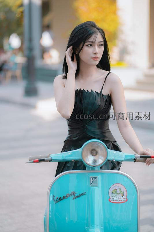 一位身穿黑色吊带裙的年轻女子,优雅地坐在一辆天蓝色复古踏板车上,背景是模糊的城市街道,阳光洒落,氛围浪漫而悠闲。