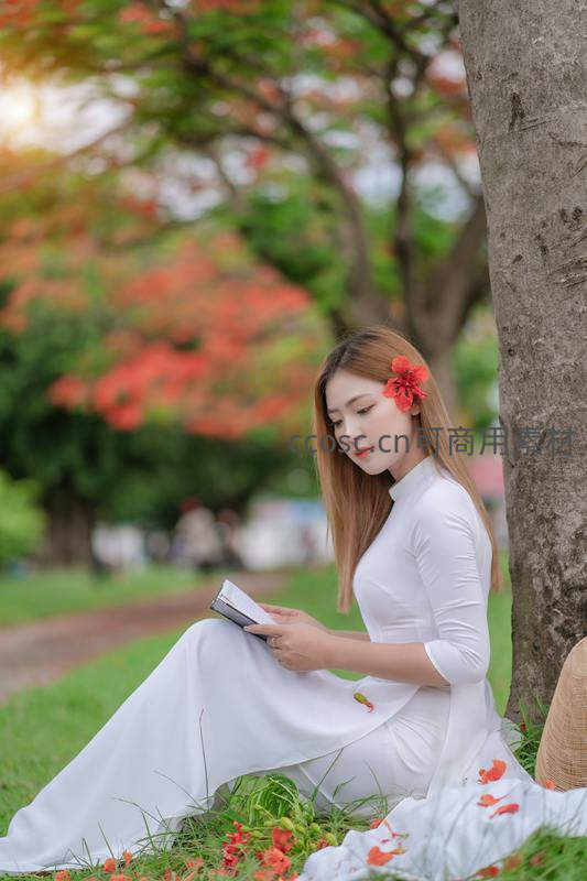 女子身着白色奥黛倚树而坐,专注阅读手中书籍,发间与衣角散落红花,周围绿草如茵,营造出宁静致远的书香氛围。