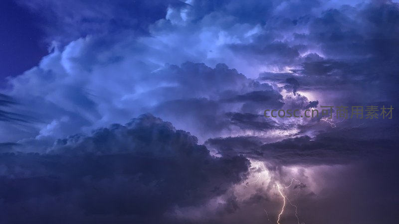 深邃的紫色雷暴云层中,数道耀眼的闪电划破长空,照亮了翻滚的云海,营造出神秘而强大的视觉冲击。