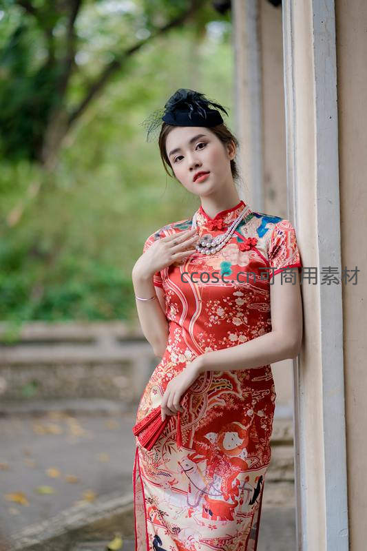 女子身着红色印花旗袍配珍珠项链与小礼帽,倚靠廊柱轻抚胸口,背景绿意盎然,尽显东方古典韵味与现代时尚融合之美。