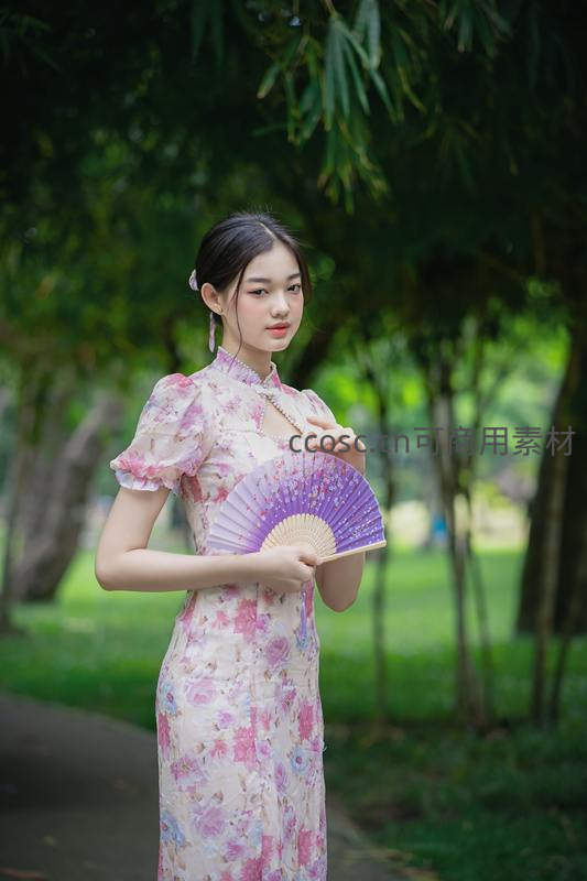 身穿粉紫花卉旗袍的少女手持一把紫色折扇,站在翠绿竹林前,神情温婉,发髻点缀淡雅发饰,整体画面洋溢着东方古典韵味。