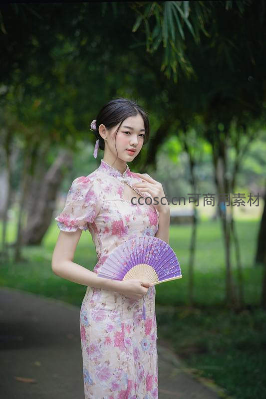 一位穿着印花旗袍的女子轻抚衣领,手持折扇,目光柔和地望向一侧,背景是朦胧竹林,展现出温婉娴静、富有诗意的东方女性之美。