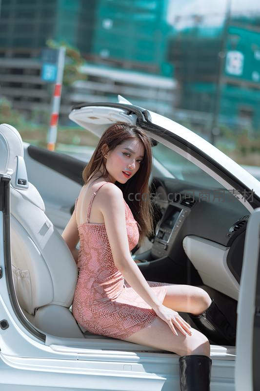 一位身着粉色亮片连衣裙的女性,优雅地坐在白色敞篷车的驾驶座上,侧身回眸,背景是模糊的城市建筑,营造出时尚、精致的都市生活氛围。