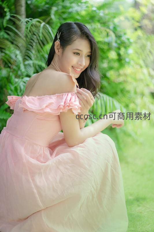 少女穿着飘逸的粉色露肩长裙,坐在翠绿草地上,面带灿烂微笑,手部轻柔摆动,享受着阳光明媚的户外时光,洋溢着轻松愉悦感。