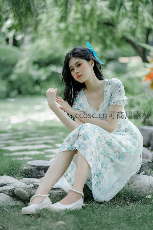一位穿着蓝白碎花连衣裙、脚踏珍珠装饰平底鞋的少女,安静地坐在青石台阶上,双手交叠置于膝前,眼神略带思索,背景是朦胧的绿植。
