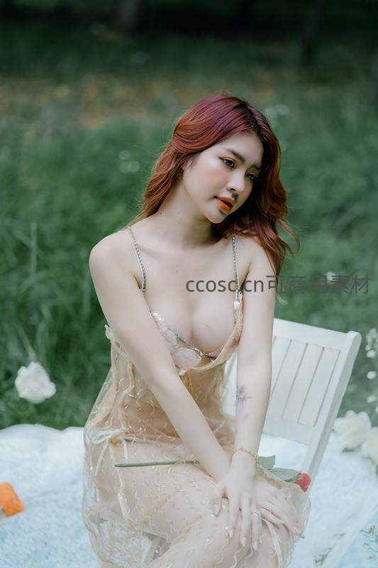 红发少女身着精致蕾丝裙,在绿意盎然的林间草地静坐,手持玫瑰,姿态柔美,背景虚化营造梦幻氛围。