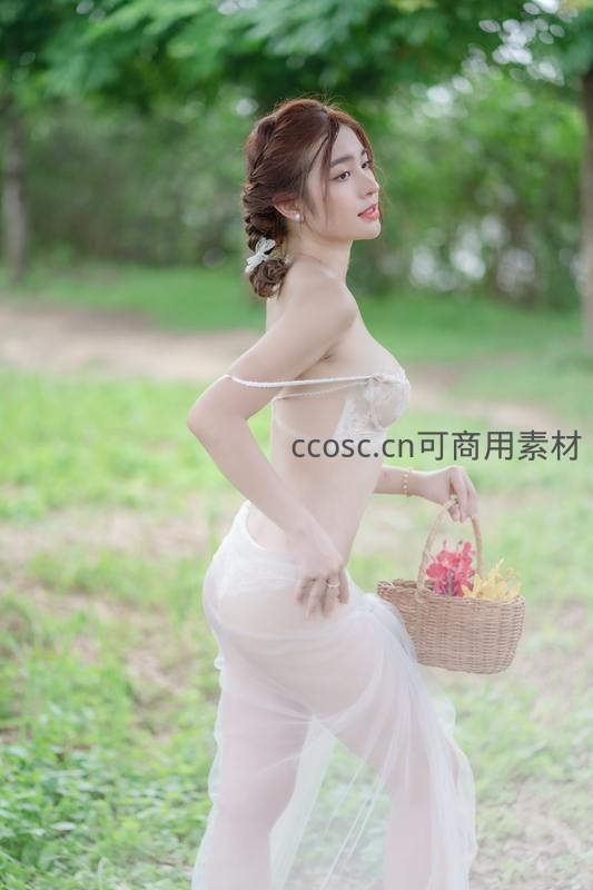她身披轻盈薄纱,手提盛满红黄花朵的藤编花篮,站在绿草如茵的林间,侧脸含笑,姿态慵懒而优雅,仿佛从油画中走出的田园精灵。