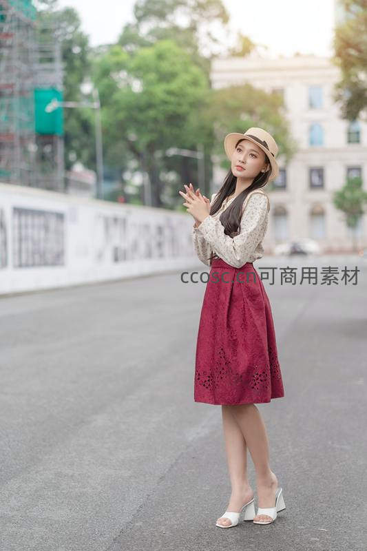 女子身穿米色上衣与酒红镂空半裙,头戴草帽站在城市街道中央,双手轻合,神情恬静,背景虚化突出主体优雅气质。