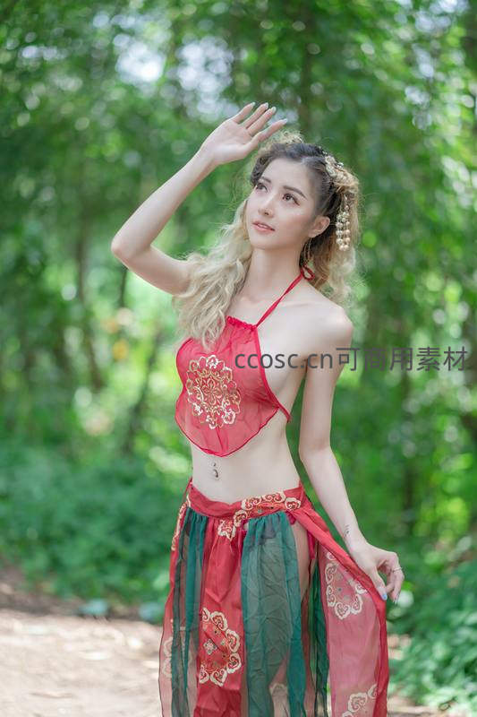 红绿舞衣女子林中抬手遮阳