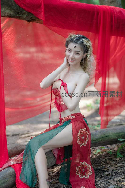 女子坐在林间木头上,身后红色纱幔飘逸,身着红绿刺绣服饰,面带微笑,营造梦幻神秘的视觉效果。