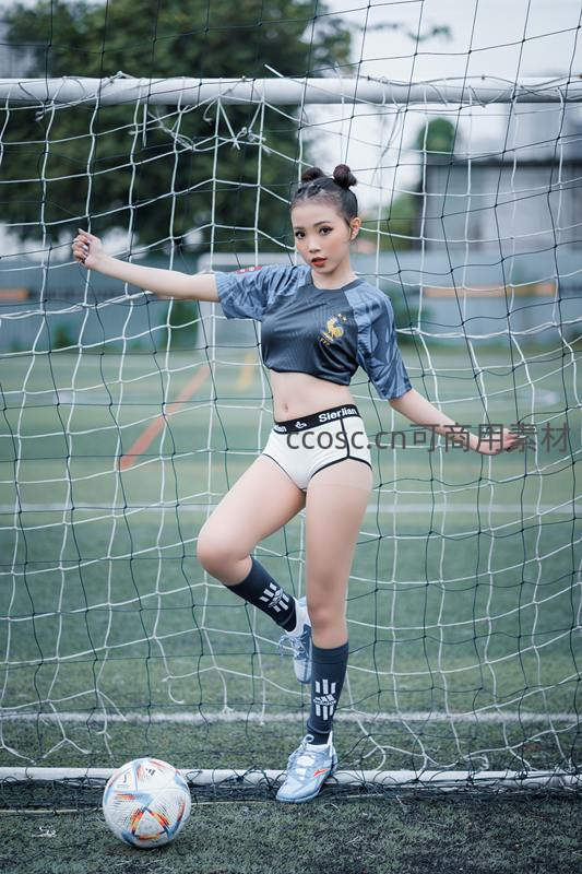 女孩穿着灰色运动上衣和白色短裤,单腿抬起靠在球门网上,另一只脚轻触足球,姿态舒展自信,背景绿茵场衬托出她的活力与健康之美。