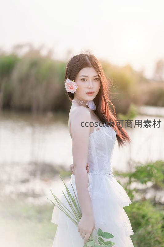 少女侧立湖畔,发间粉花点缀,白色蕾丝裙摆轻扬,逆光勾勒柔美线条,背景水波粼粼,营造宁静唯美的自然人像画卷。