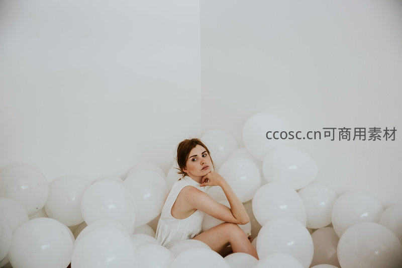 一位身穿白色连衣裙的女子坐在铺满白色气球的角落,手托下巴若有所思,纯白背景与气球营造出梦幻、纯净又略带孤独的艺术氛围。