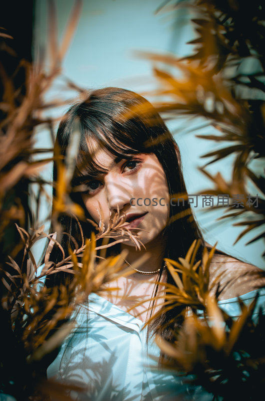 透过层层叠叠的棕榈叶片,一位女子的脸庞若隐若现,阳光在她脸上投下斑驳的树影,营造出一种神秘、清新且富有艺术感的视觉效果。