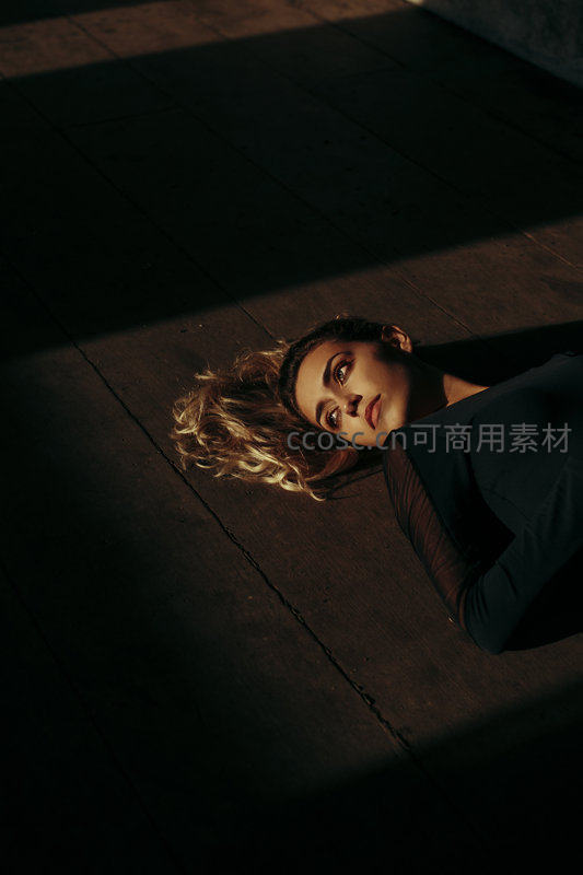 女子躺在木质地板上,一束阳光照亮她的脸庞和卷发,其余部分隐于阴影中,营造出强烈对比和戏剧性的情绪表达。