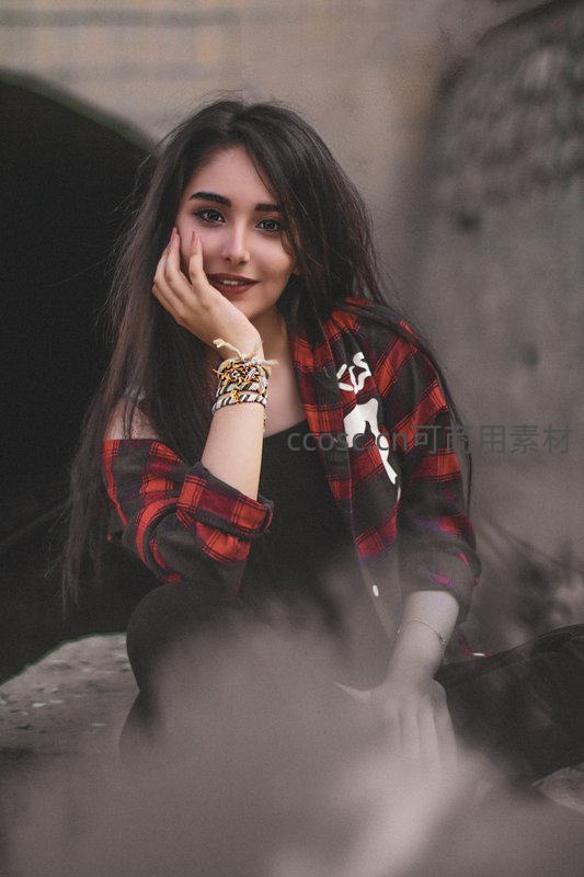 长发少女身穿红黑格子衬衫,倚靠在斑驳的墙边,手托脸颊微笑,前景弥漫着朦胧烟雾,营造出一种神秘又温柔的氛围。