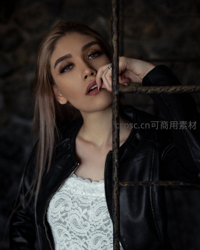 铁栅栏后沉思的皮衣美人