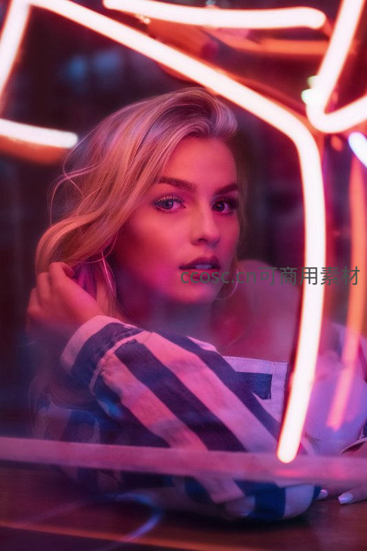 金发女子置身于粉紫色霓虹灯管环绕的空间,身穿蓝白条纹上衣,一手撩动发丝,眼神迷离,整个画面充满未来感与都市夜生活的魅力。