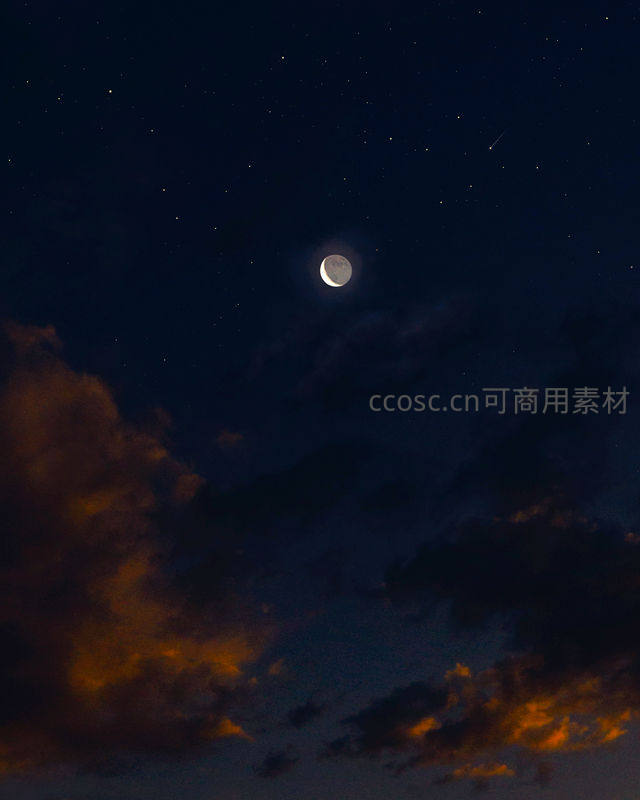 一弯新月悬于夜空,被染上暖色的云层环绕,一颗流星划过天际,捕捉到这稍纵即逝的浪漫天文瞬间。