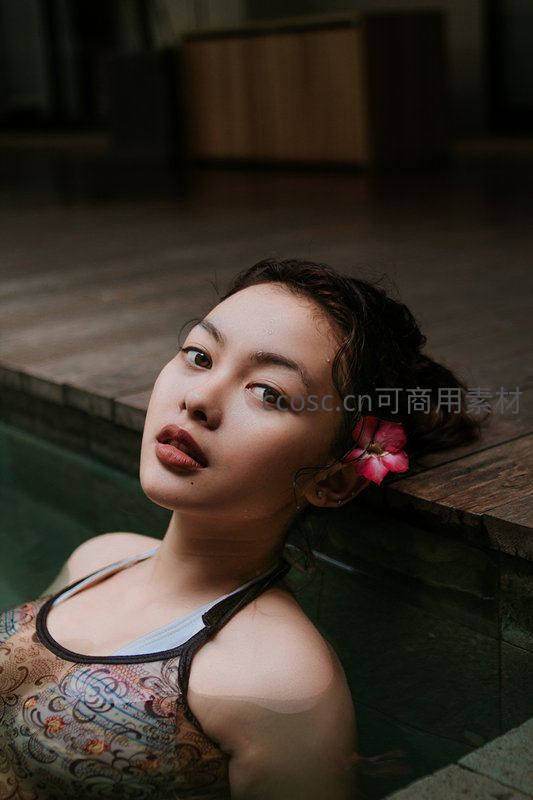 一位女子半卧在泳池边缘,湿发上别着一朵鲜艳红花,眼神迷离地望向镜头,身上隐约可见彩色纹身,氛围慵懒而富有艺术感,尽显度假风情。
