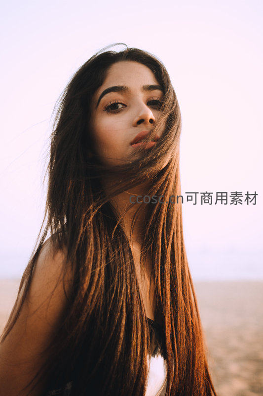 一位年轻女性在海边,微风吹动她飘逸的长发,阳光洒在脸上,营造出宁静而浪漫的氛围。