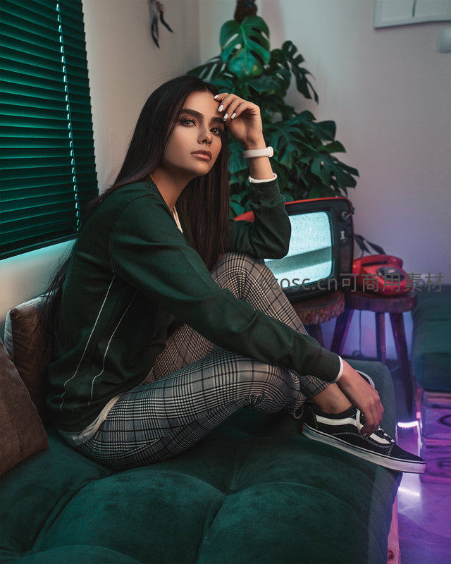 女子坐在墨绿色沙发上,背景是老式电视机和热带植物,整体色调复古又现代,充满生活气息。